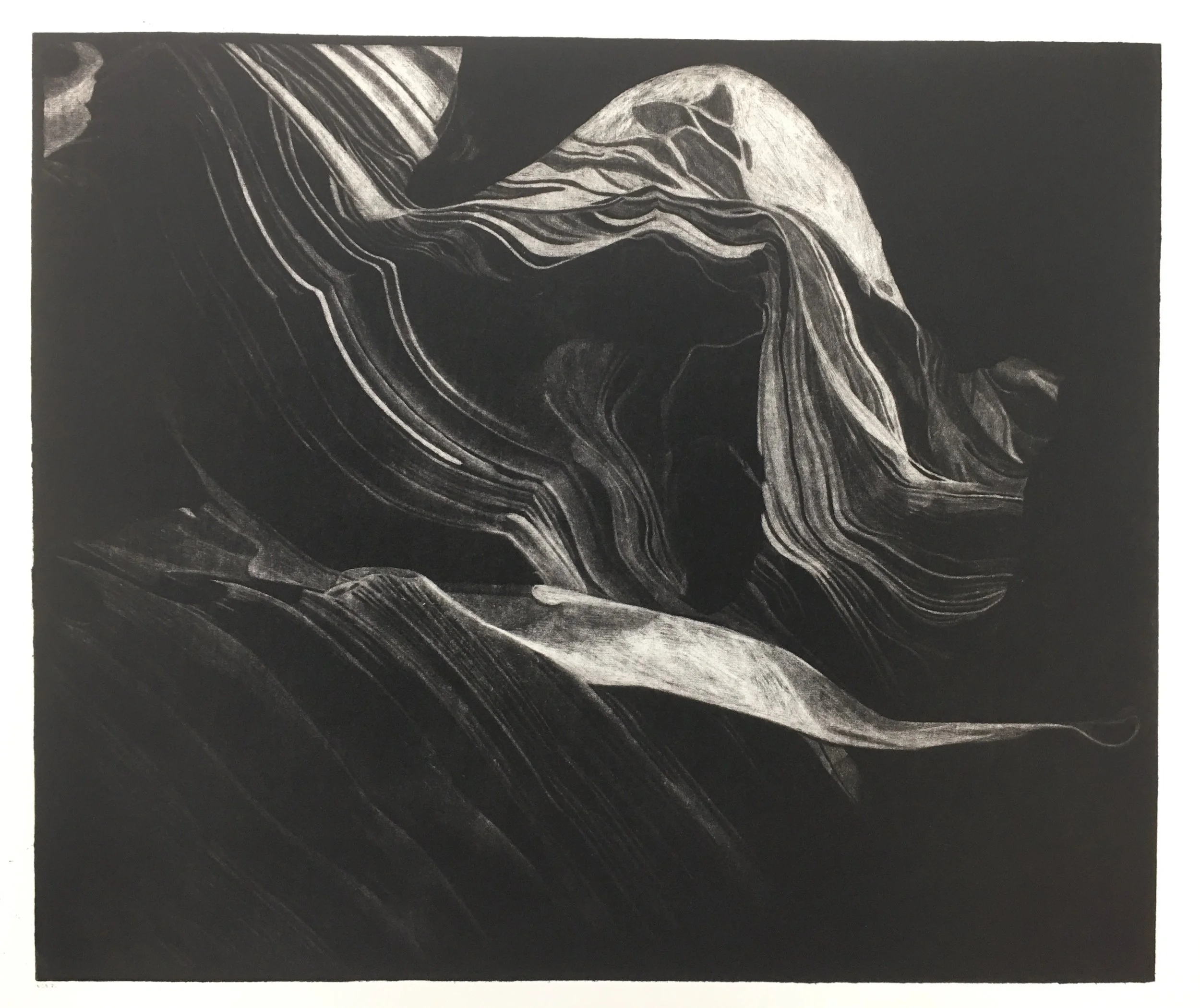 Similar to aquatint, this technique allows printmakers to achieve soft gradations of tone without using line- or dot-based techniques such as hatching or stipple. The plate is worked with a rocker, creating a rough surface which will hold ink and produce an overall black velvety effect. Having created this texture on the plate, metal scrapers are then used to burnish/flatten out selected areas of the plate, intended to be white in the final image. The artist therefore develops the image from dark to light, manipulating tones to create the final result.