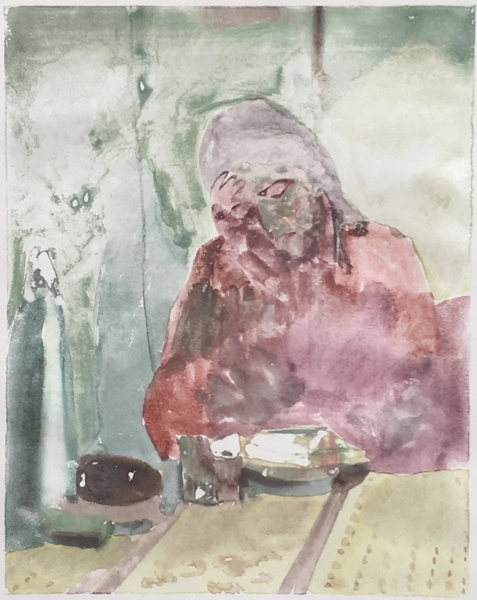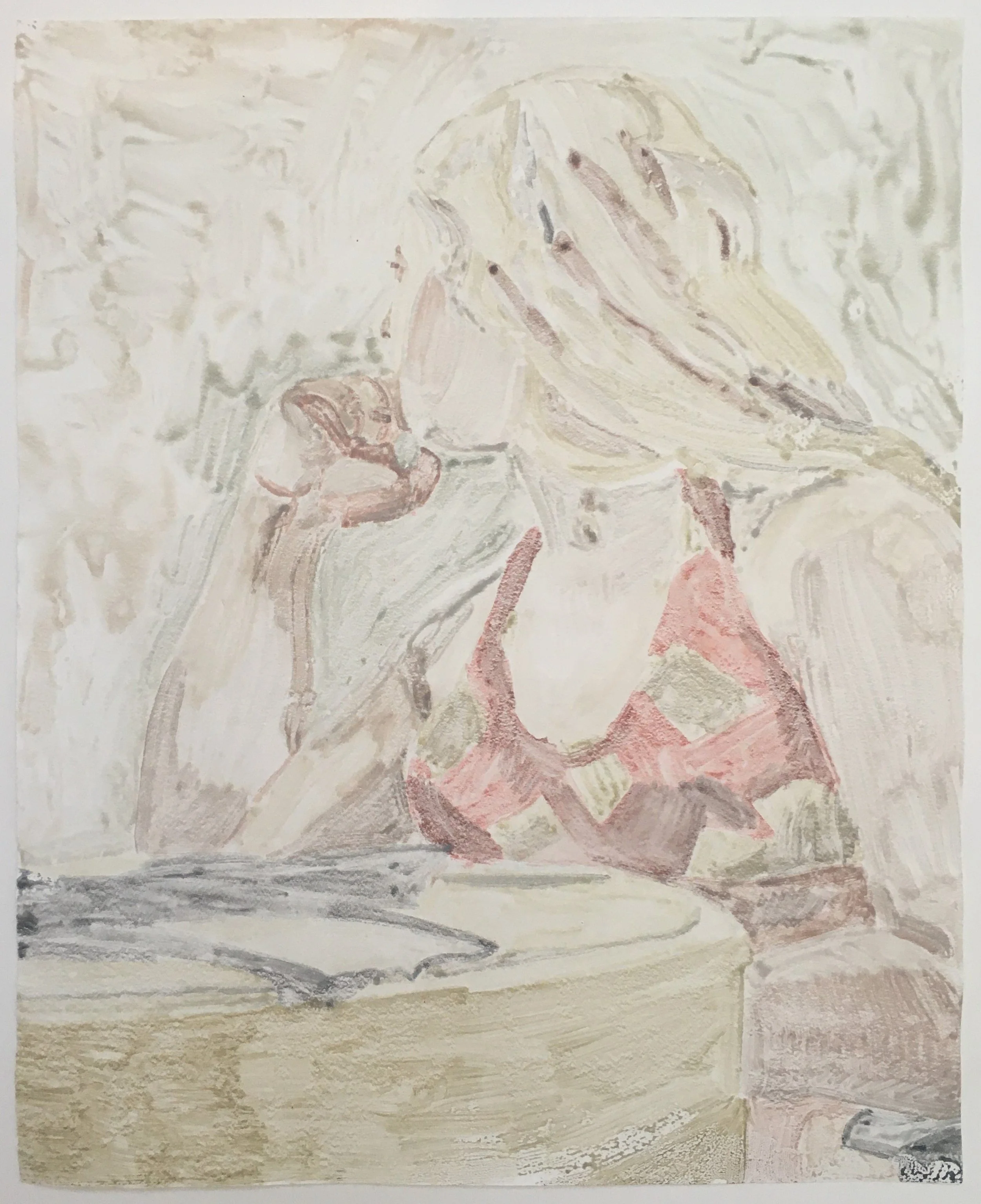 I think it’s interesting this idea of the image as an empty vessel for your projections and own feelings to flood into. There is also a muted tonality in your work, emphasised by the formal bleeding between colours and thinly applied gouache. To me, this creates distance between the image and viewer - the figures appear in a dream-like or contemplative state as they gaze beyond us. It is as though we’re intruding on their domestic moments of quiet intimacy.