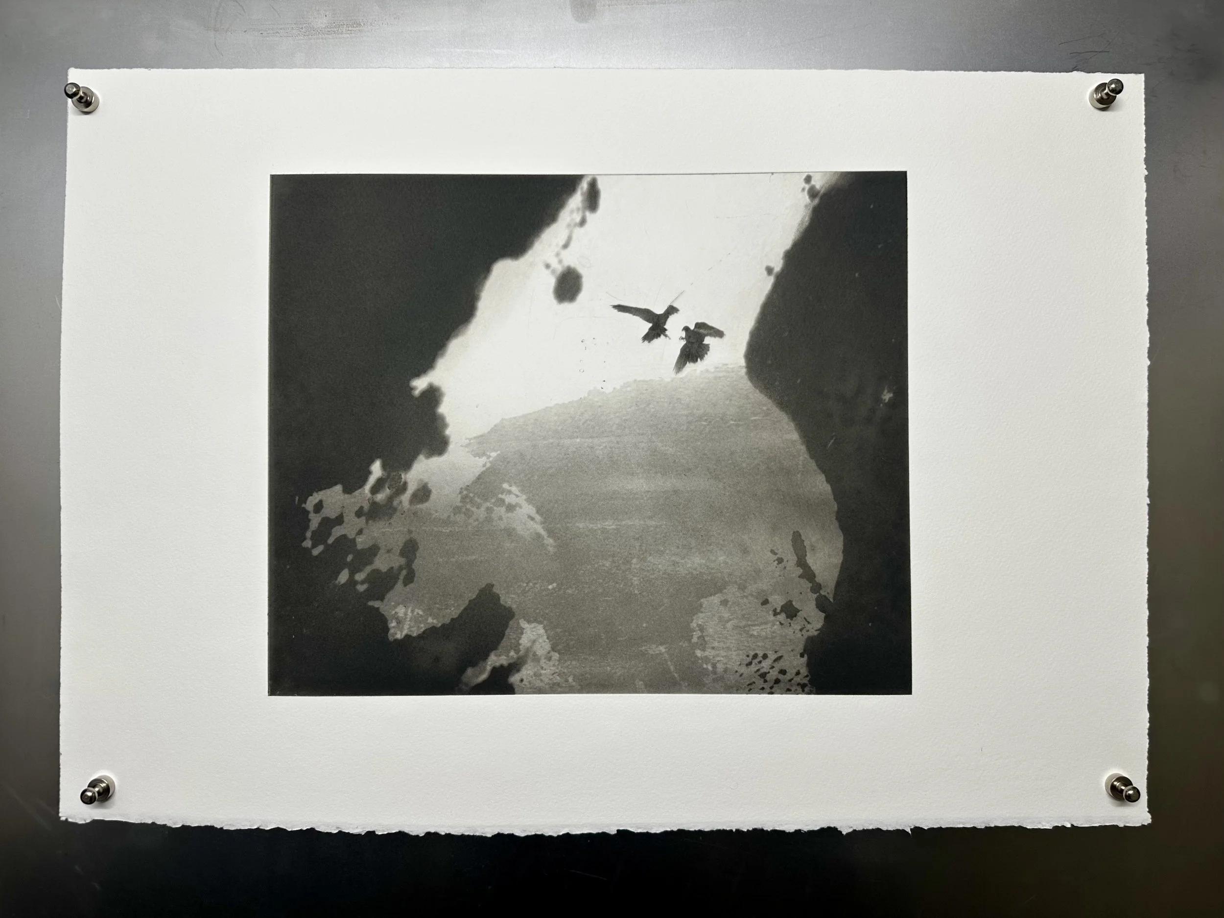 Photopolymer lets us seamlessly combine our marks, but it’s actually more expensive and time-consuming than traditional etching. We scan metal etchings, overlay them, and transfer them onto photopolymer plates—all while maintaining mark integrity. Some stigmatize photopolymer, but it’s still etching, just with water instead of acid. We ignore skepticism and focus on pushing landscape art forward with influences from film and gaming.